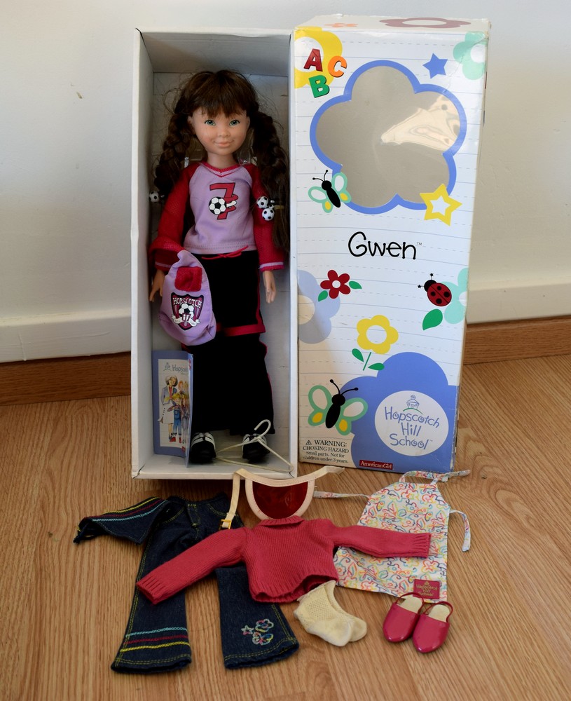 Il s’agit de Gwen, l’une des poupées American Girl de la gamme Hopscotch Hill School, commercialisée de 2003 à 2006. Il s’agit de poupées à perruque de 16″ (42cm), possédant 9 points d’articulation. Toutes les poupées de cette gamme ont les yeux peints. Elles étaient destinées aux fillettes de 4 à 6 ans.