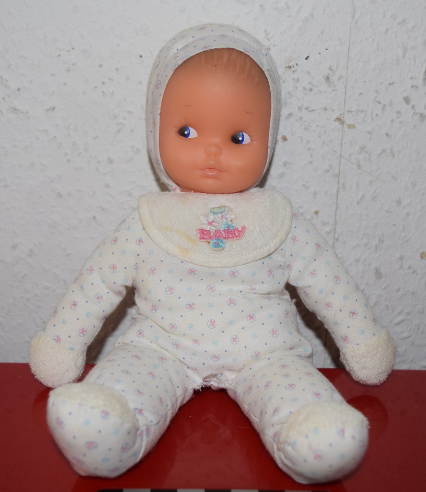 Au catalogue Clodrey de 1980, Bébé plume est un jetpartout de 50 cm tout de bleu vêtu. Ce pantin premier âge était vendu en sachet.
