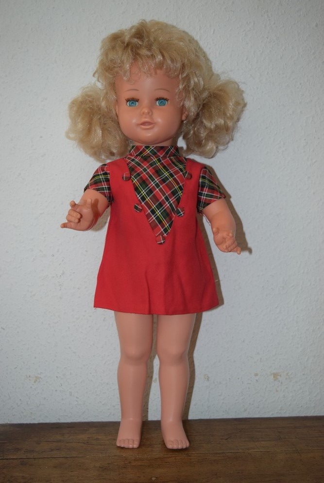 Sa tête et ses bras sont en vinyle et élastiqués. Son corps et ses jambes, élastiquées également, sont en polyethylène.