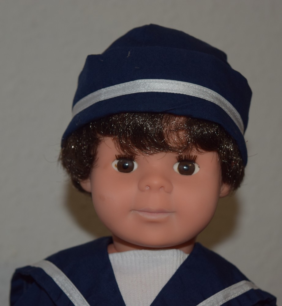 Jean-Michel est vêtu d’un costume marin très en vogue au début du XXème siècle. Cette tenue a été achetée à Paris, à la fin des années 90, dans la boutique de la rue de la Pépinière.
