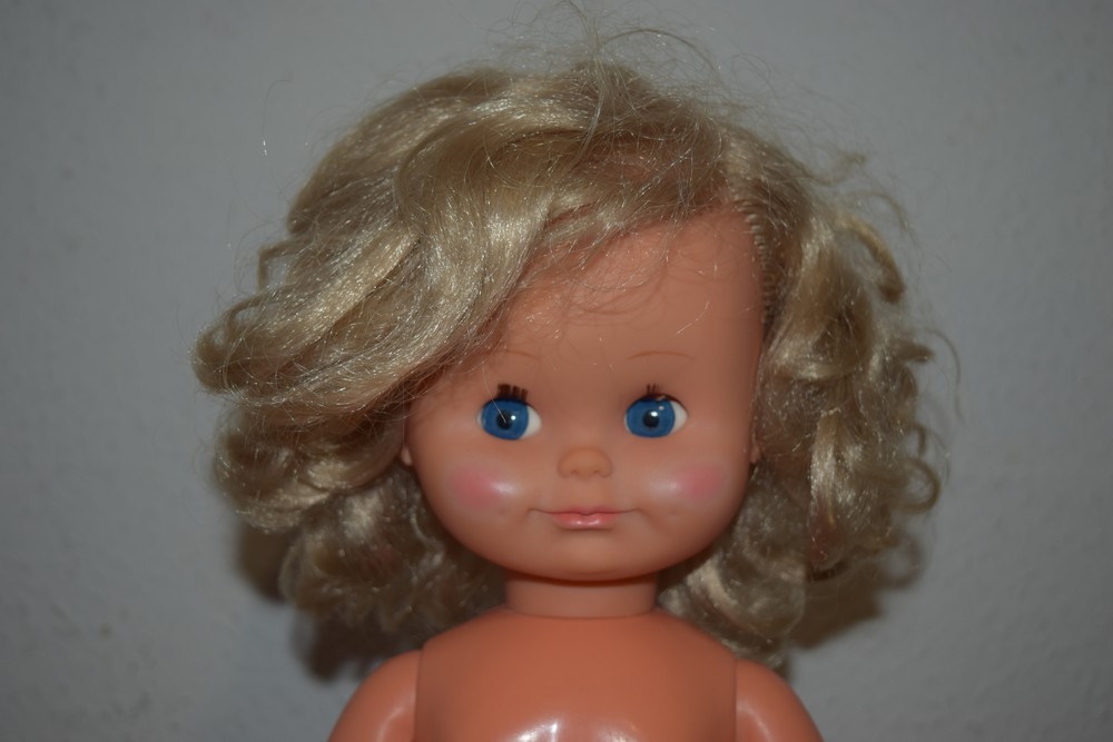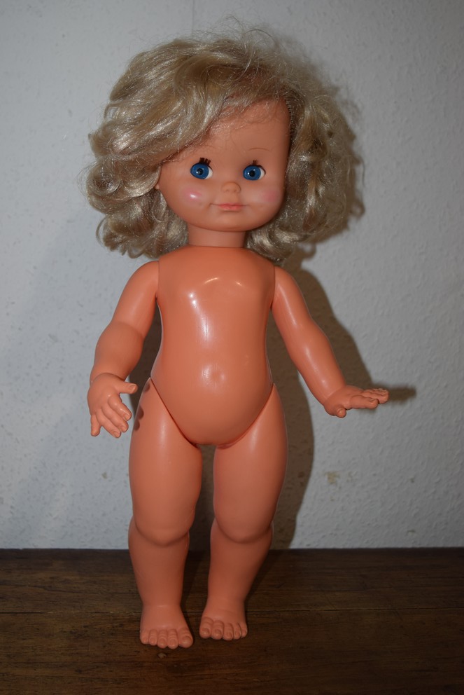 Cette amusante poupée de 45 cm a la tête (emboîtée) en plastisol ; son corps et ses membres (jambes emboîtées et bras élastiqués) sont en polyethylène.