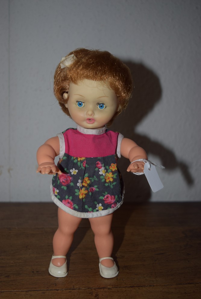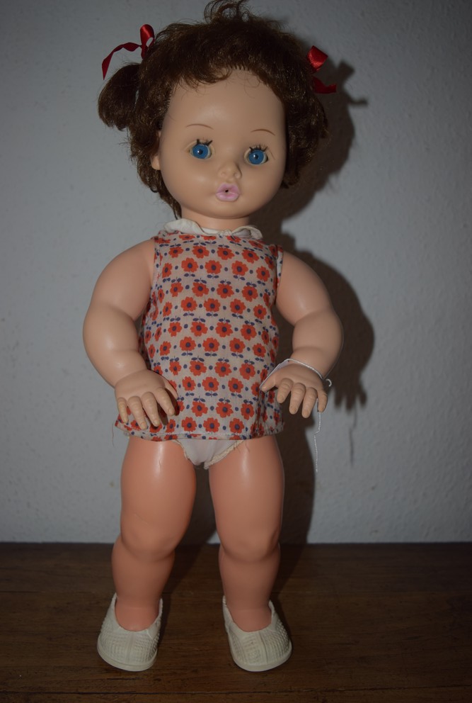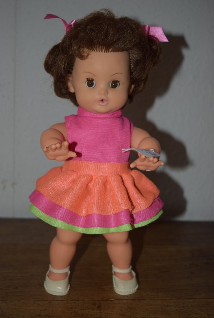 Ses yeux dormeurs sont marrons ; ses cheveux courts sont en clorène et coiffés avec deux couettes. Elle aussi est du début des années 60.