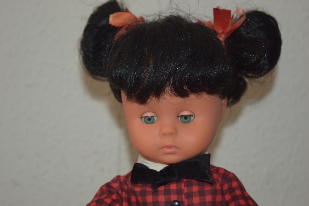 Elle a des yeux dormeurs bleus-gris et des cheveux implantés noirs coiffés avec deux couettes ; les rubans qui les attachent sont d’origine.