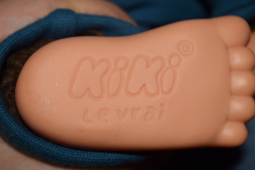 Sous le pied gauche, « Kiki le vrai » imprimé, les yeux sont marrons et il suce une sucette avec sa main droite.