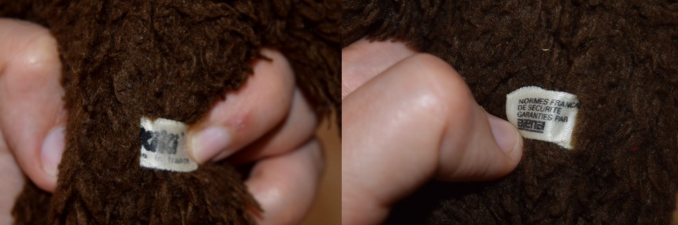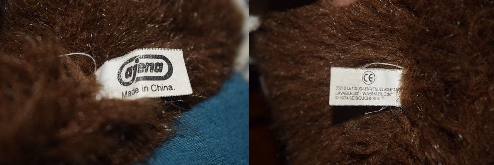 A partir de la fin des années 80, Kiki est fabriqué en Chine. Les étiquettes cousues au corps des petits singes indiquent au recto Ajena made in China et au verso CE AJena F Luché Pringé – lavable 30 ° – Washable 30° ©1974 Sekiguchi – Kiki ®.