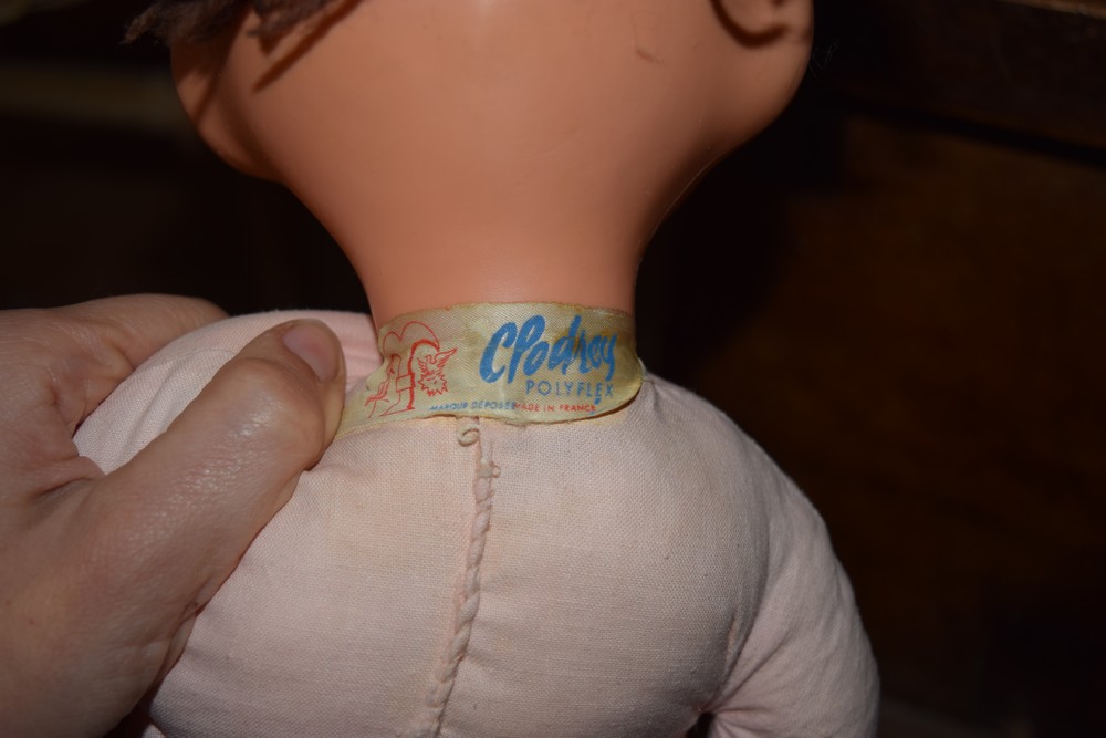 - la pauvrette avait aussi perdu beaucoup de ses cheveux de laine jaune au cours de ces cinquante-cinq dernières années ; elle a dû subir une réimplantation partielle. Comme en restauration archéologique, la différence de couleur permet de distinguer les cheveux d’origine des ajouts récents. Il aurait été de toutes façon trop compliqué de recréer la teinte exacte et pas question pour nous de remplacer les cheveux encore existants ;