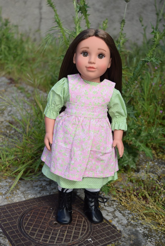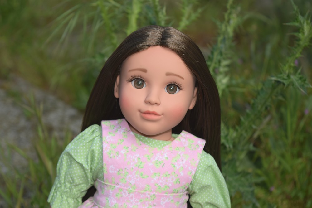 Elle mesure 18″, soit un peu plus de 46 cm. Sa tête et ses membres sont en vinyle. En vraie fille de ferme vivant au grand air, ses avants-bras sont légèrement bronzés.