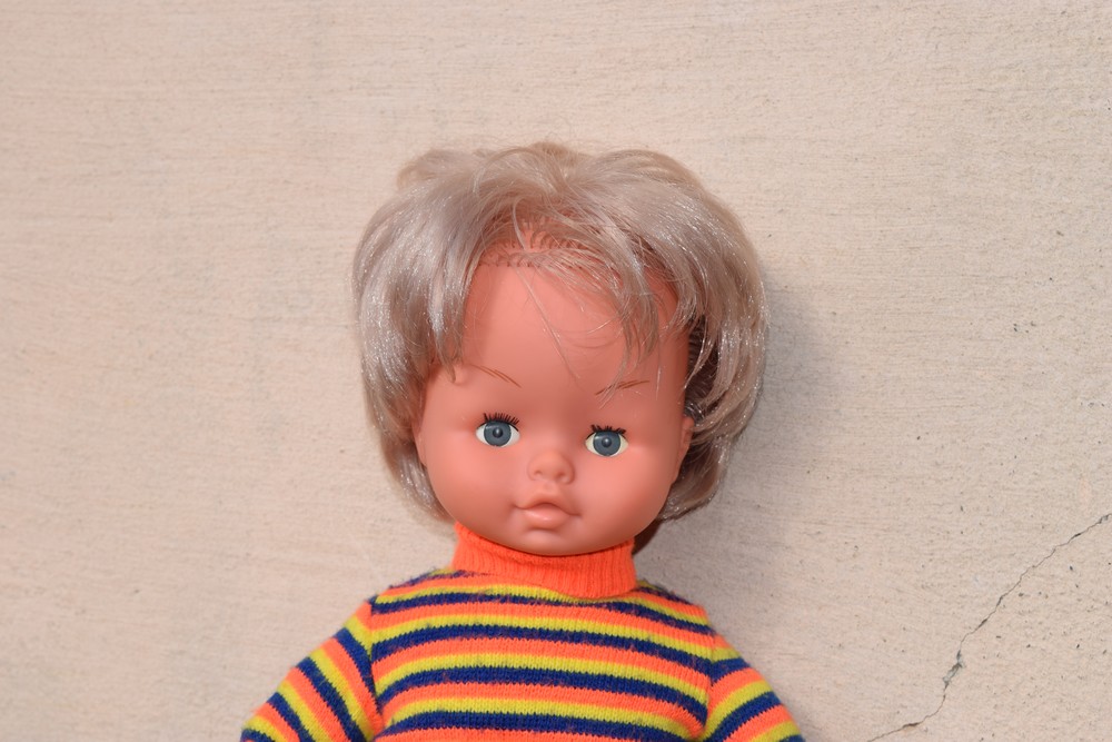 Frédéric est un poupon Gégé de 45 cm. Sa tête et ses membres sont en vinyle. Son corps en toile orange bourrée de mousse de polyuréthane et zippée renferme son mécanisme électrique. Il a des yeux dormeurs bleus et des sourcils dessinés de trois traits. Ses cheveux implantés sont blonds et coiffés également à la mode des années 70.