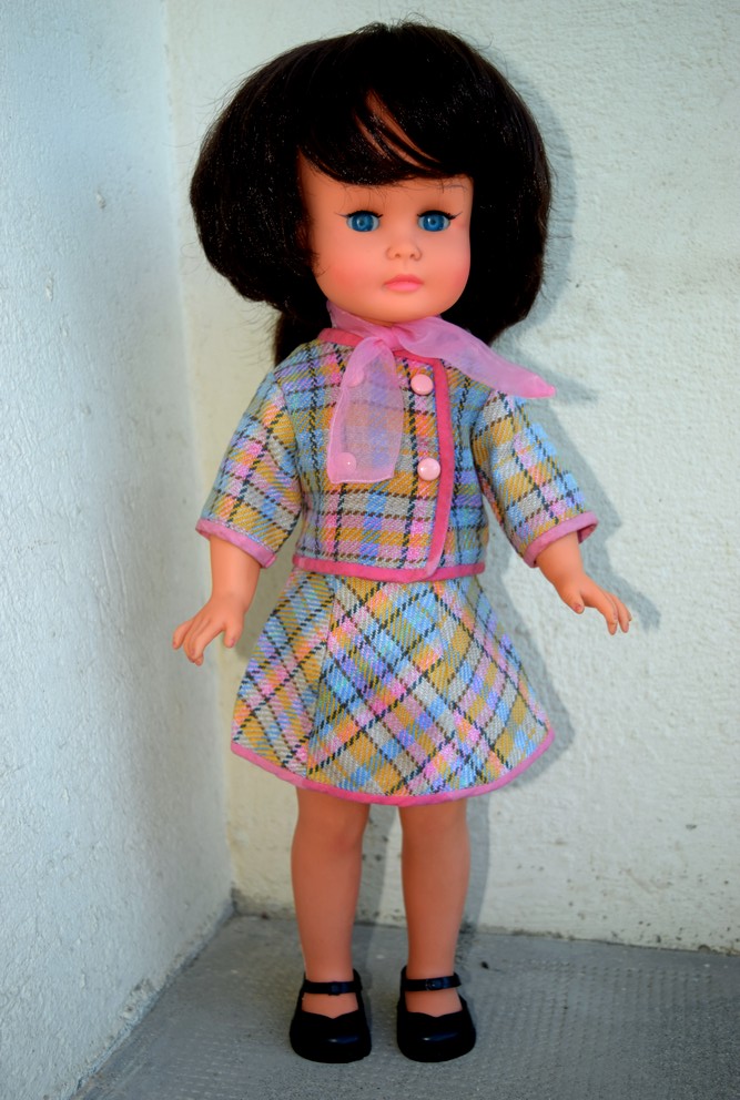 Ses sourcils sont originaux ; ils ne sont ni classiques ni vol d’oiseau, mais ressemblent à ceux d’autres poupées Clodrey du milieu des années 60, comme Isabelle, Fanfan ou une Paloma que j’ai récemment croisée.