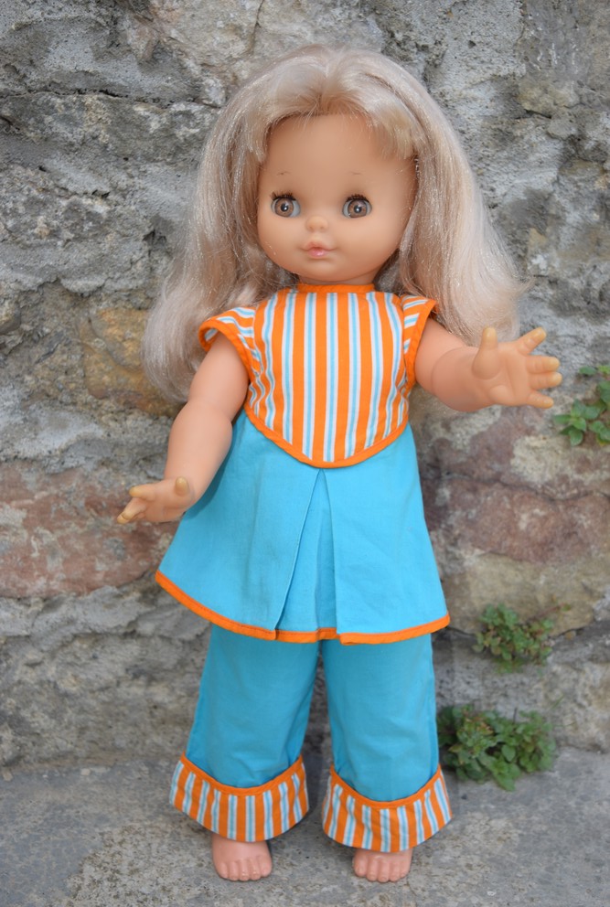 La poupée présentée est vêtue de sa combinaison pantalon en lainage de 1971 ; il lui manque son poncho.