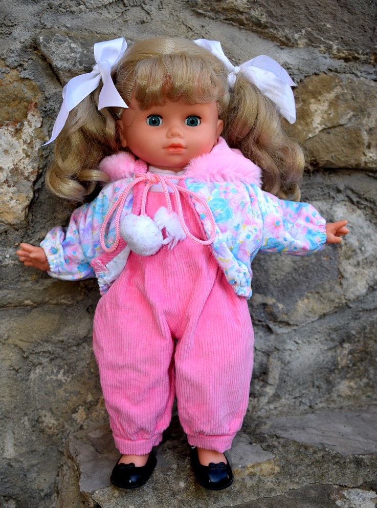 Aujourd’hui, la déception de ce soir de Noël 1998 ou 1999 étant loin, je trouve cette poupée de 42 cm au corps bourré plutôt jolie même si les finitions laissent effectivement à désirer : ses chaussures, un poil trop grandes étaient directement « cousues » à ses pieds au moyen de ces petits liens en plastique servant à fixer les étiquettes sur les vêtements.