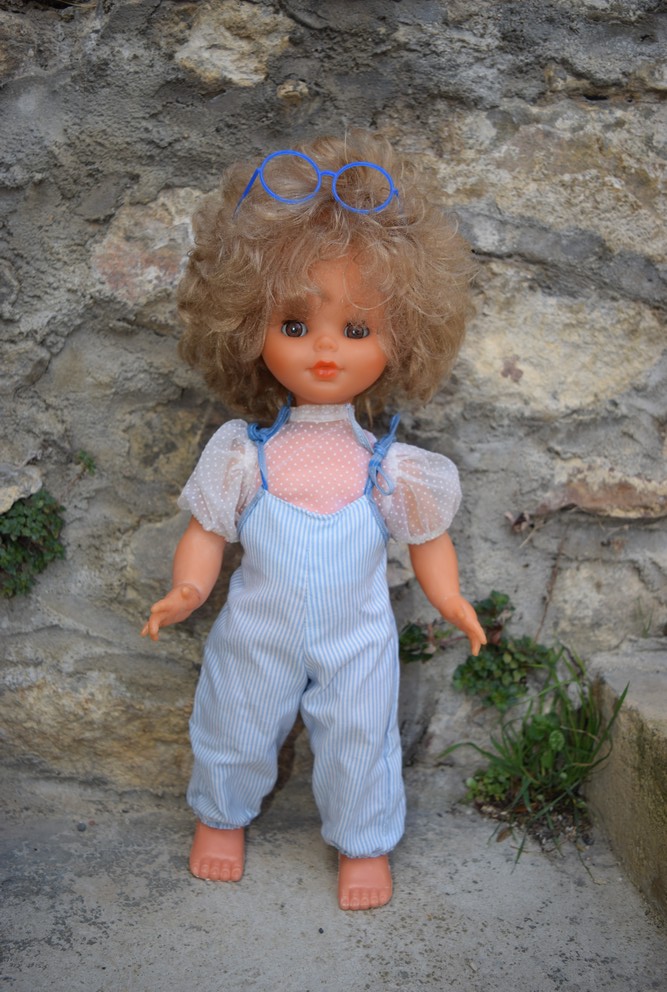 Mélanie est une demoiselle à la mode. Au catalogue Bella de 1984, cette poupée était proposée dans trois tenues, celle portée par la poupée ci-dessous composée d’une salopette rayée et d’un chemisier en plumetis blanc, et deux robes, l’une bleu-lavande, l’autre rayée.