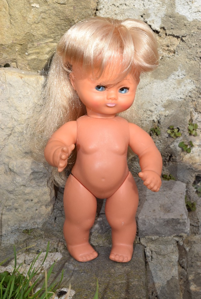 Sylvette ressemble beaucoup à sa cousine Poucette, une petite poupée Clodrey de la même taille, 24 cm, et à la même moue boudeuse.