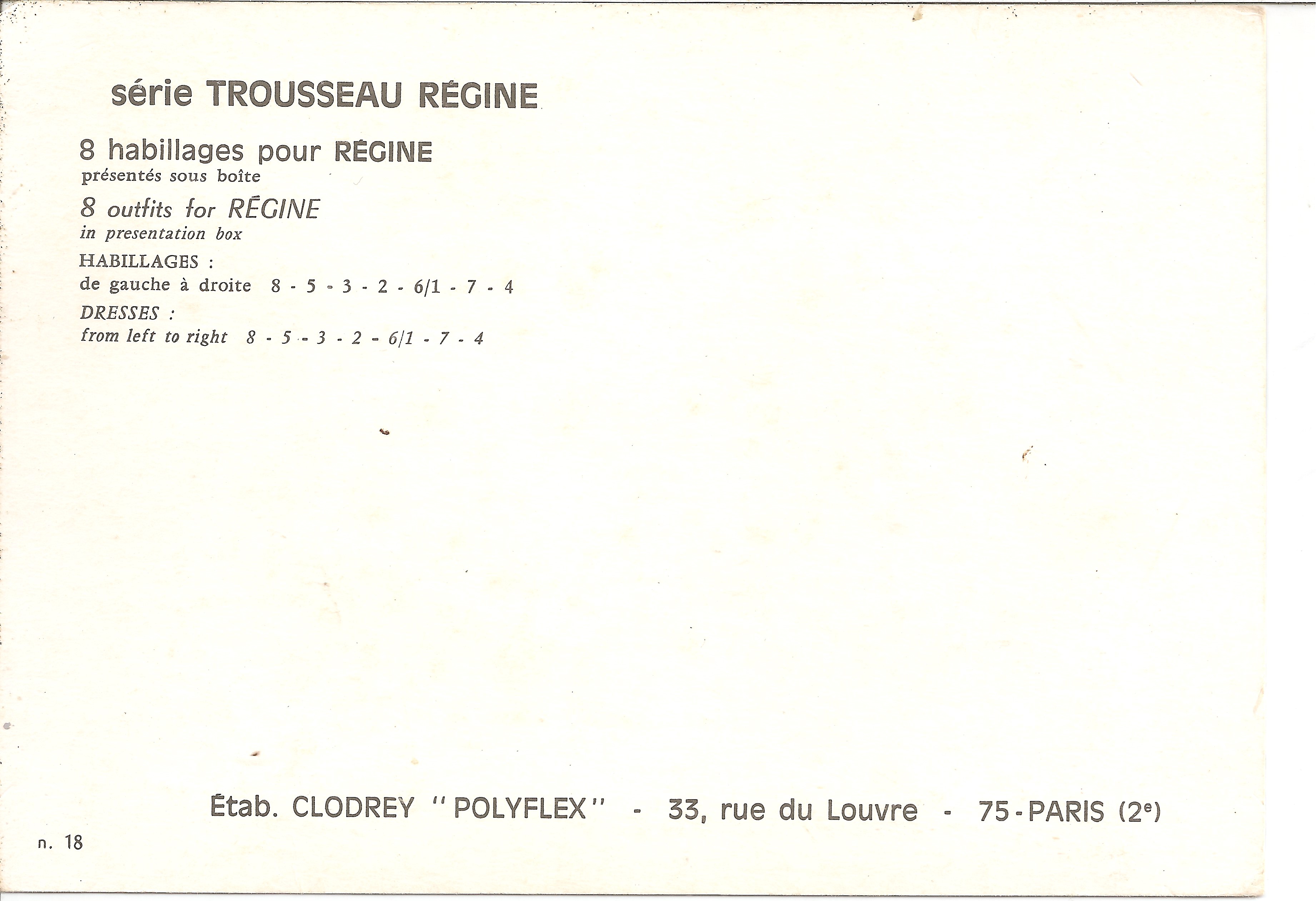 Voici tout d’abord la première série estampillée Clodrey. Au dos de chaque carte, on découvre une description en français et en anglais des modèles présentés au recto.