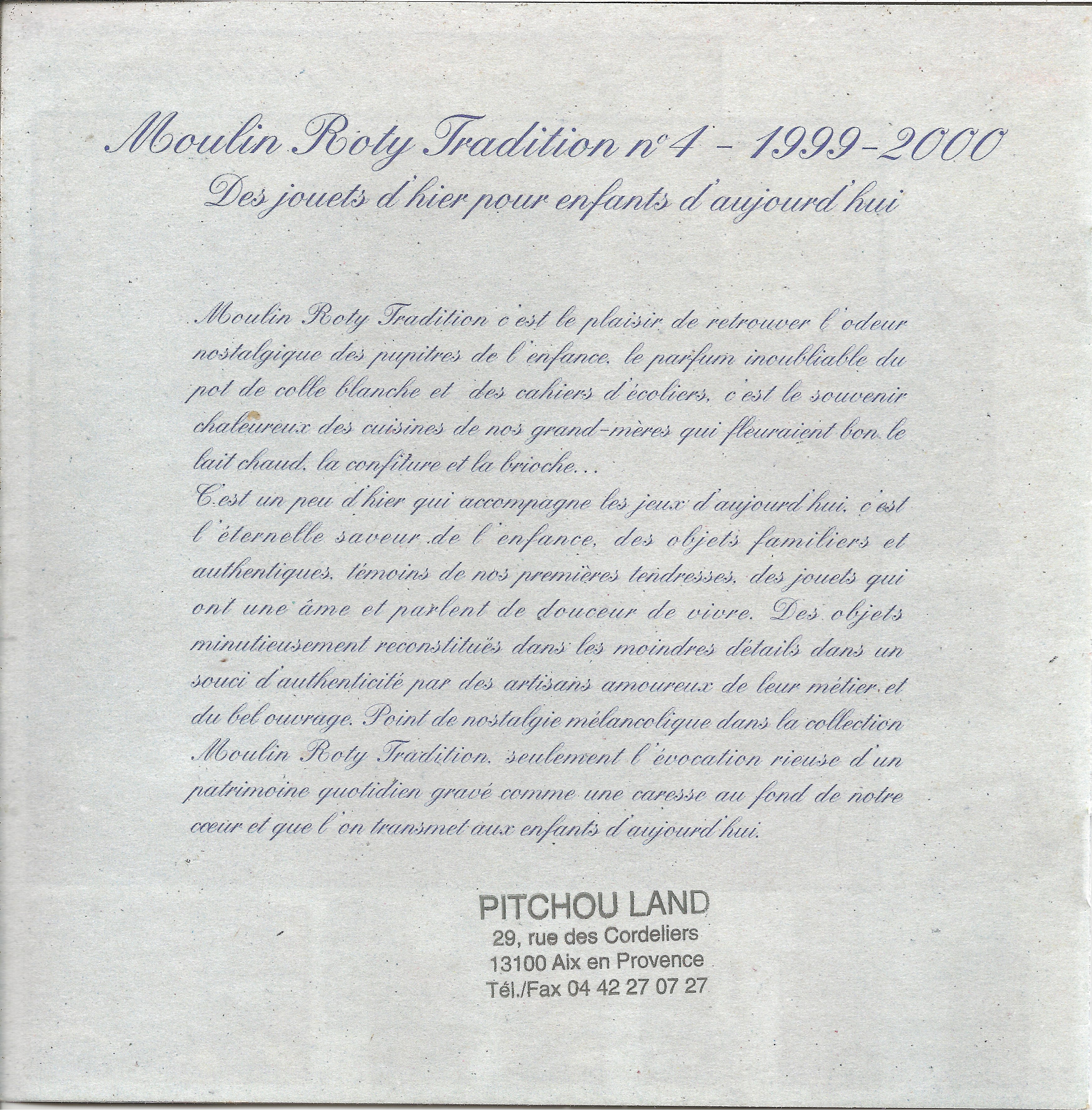 Alors quand je suis récemment tombée sur ce mini-catalogue, je n’ai pas pu résister à l’envie de l’acheter, histoire de rêver à nouveau à tous ces jolis jouets à l’ancienne proposés à l’aube de l’an 2000 par la maison Moulin Roty.