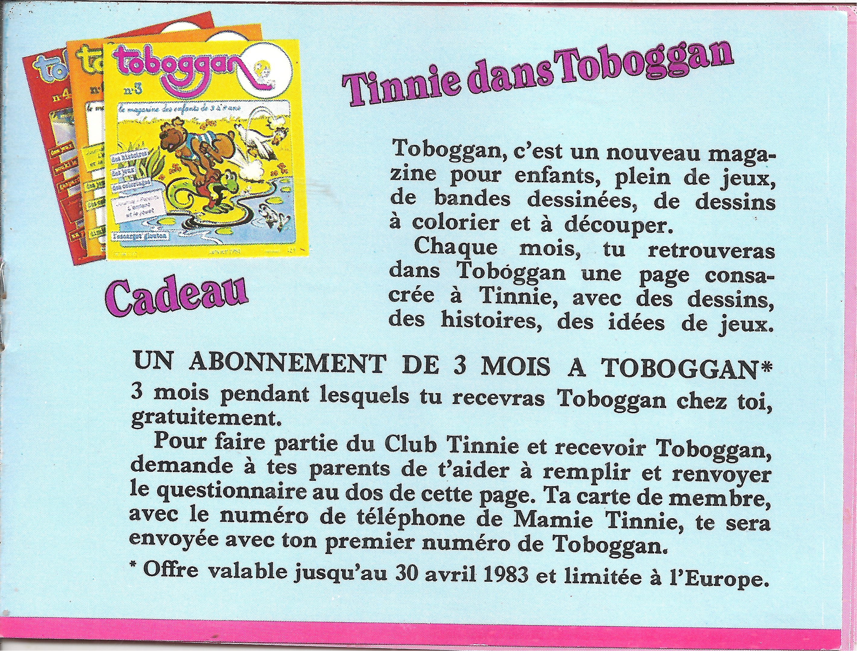 Derrière la case du jour se cache un petit catalogue consacré à la poupée Tinnie ainsi qu’à ses tenues et accessoires que nous pensons pouvoir attribuer à 1983 (éventuellement fin 1982).