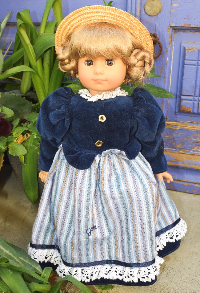 Adoptée neuve en boîte, notre mystérieuse demoiselle porte sa tenue d’origine : une robe composée d’une jupe en toile rayée et d’un corsage en velours bleu nuit, un long panty blanc, des chaussettes blanches, une paire de chaussures à lacets noires et un chapeau de paille.