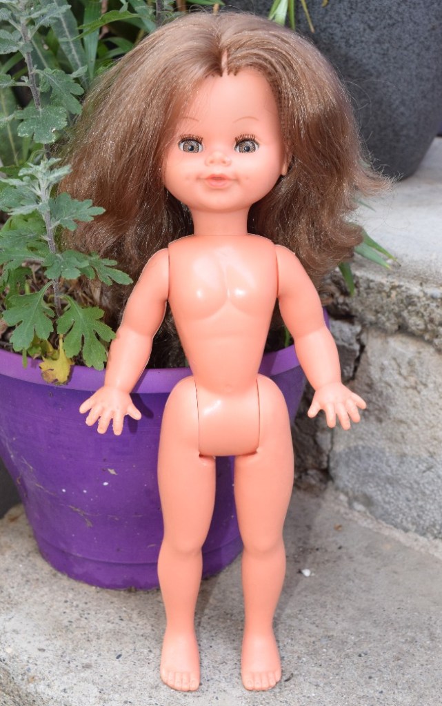 Nous avons fini par découvrir qu’il s’agit d’une poupée spécialement créée pour le distributeur SOCOJOU en 1974. Elle était vendue 32 F, soit 27 € au 31 mars 2021*, un prix modeste si on le compare à celui d’autres poupées Bella similaires, et notamment à celui d’Ella (59,50 F, soit 49 €*), une poupée de même taille, sans mécanisme électrique mais dont les jambes en mousse armée lui permettaient de prendre diverses positions.