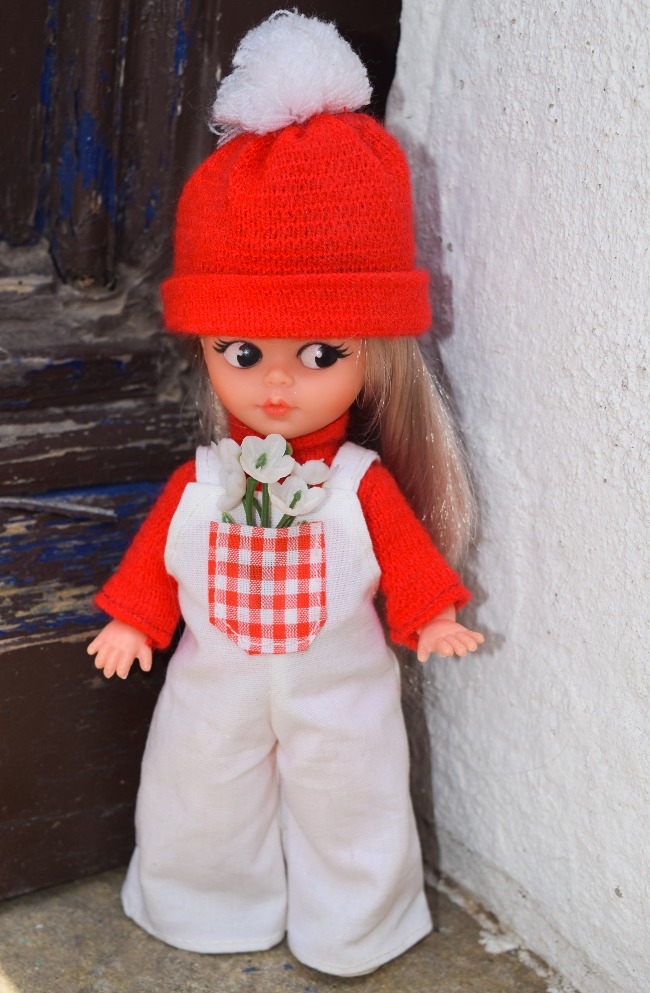 Cette adorable petite poupée Bella est la dernière de la série des Microbe mais aussi la plus facile à identifier et dater avec ses grands yeux peints. On la trouve au catalogue Bella de 1978 à 1981.