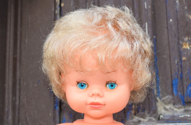 Nous avons fini par découvrir qu’il s’agit d’une poupée spécialement créée pour le distributeur SOCOJOU en 1974. Elle était vendue 32 F, soit 27 € au 31 mars 2021*, un prix modeste si on le compare à celui d’autres poupées Bella similaires, et notamment à celui d’Ella (59,50 F, soit 49 €*), une poupée de même taille, sans mécanisme électrique mais dont les jambes en mousse armée lui permettaient de prendre diverses positions.
