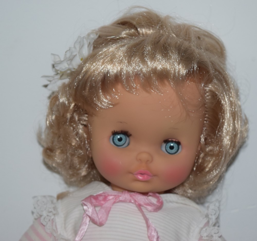 La nouvelle Félicie a la tête en vinyle. Ses cheveux sont implantés et ses yeux non coucous sont dormeurs. Ses sourcils sont dessinés en vol d’oiseau. La nôtre est blonde aux yeux bleus gris.